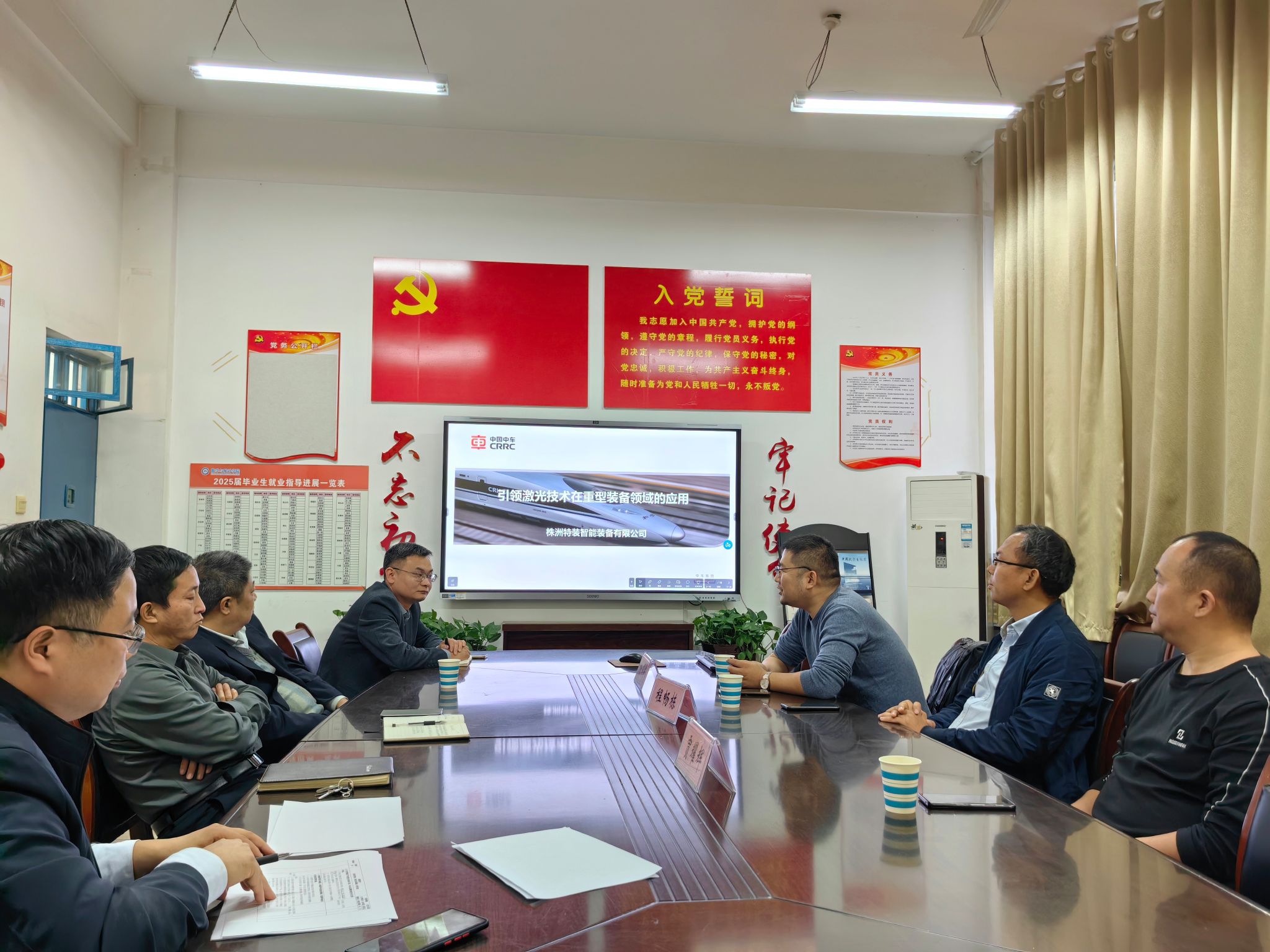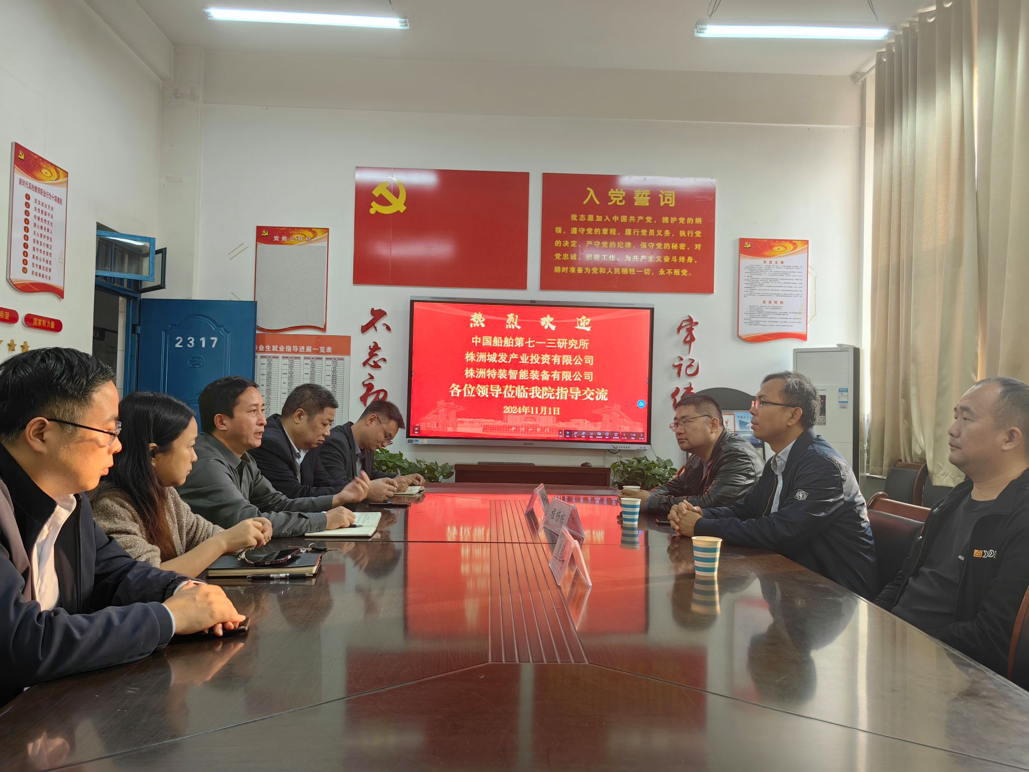 11月1日下午,中国船舶重工集团公司第七一三研究所装备保障部部长贾耀辉、株洲城发产业投资有限公司副总经理杨军芳、株洲特装智能装备有限公司总经理程畅栋到公司调研交流。座谈会在2317会议室召开,公司领导班子及相关教师代表参加了会议。