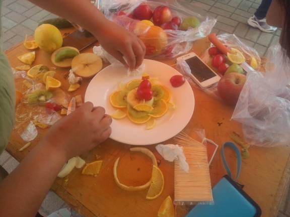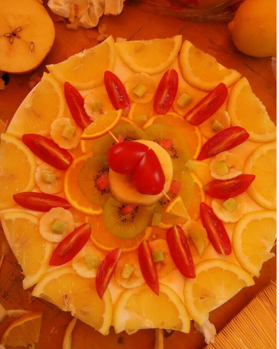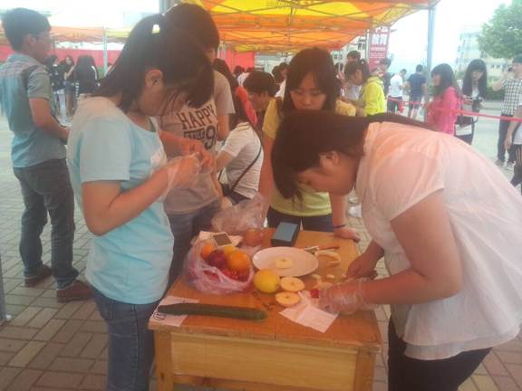 主持人说明规则后,比赛正式开始。数学与信息科学公司公司的作品是“荷塘月色”——柠檬、苹果、奇异果等组成的水果拼盘,五颜六色,圣女果拼出来的爱心更是栩栩如生。公司同学团结协作,密切配合,根据所提供的有限水果进行构思、雕刻与拼接,在近40分钟的努力后将作品完美呈现在大家眼前。