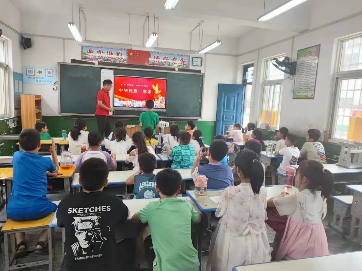 为了全面贯彻落实党的二十大精神,铸牢中华民族共同体意识,加强民族团结,7月19日,RM365英国官网“学思想·守初心·燃青春”筑梦服务团于鲁山县四棵树第三小学开设了民族团结小课堂。