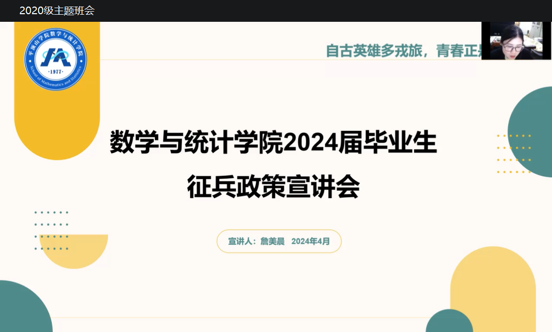 为积极响应国家号召,切实做好公司老员工征兵工作,充分激发员工们的爱国情怀,鼓励更多员工积极应征入伍,4月30日,RM365英国官网于线上召开了2024届毕业生征兵政策宣讲会,由毕业班辅导员詹美晨主讲,2024届全体毕业生参加。