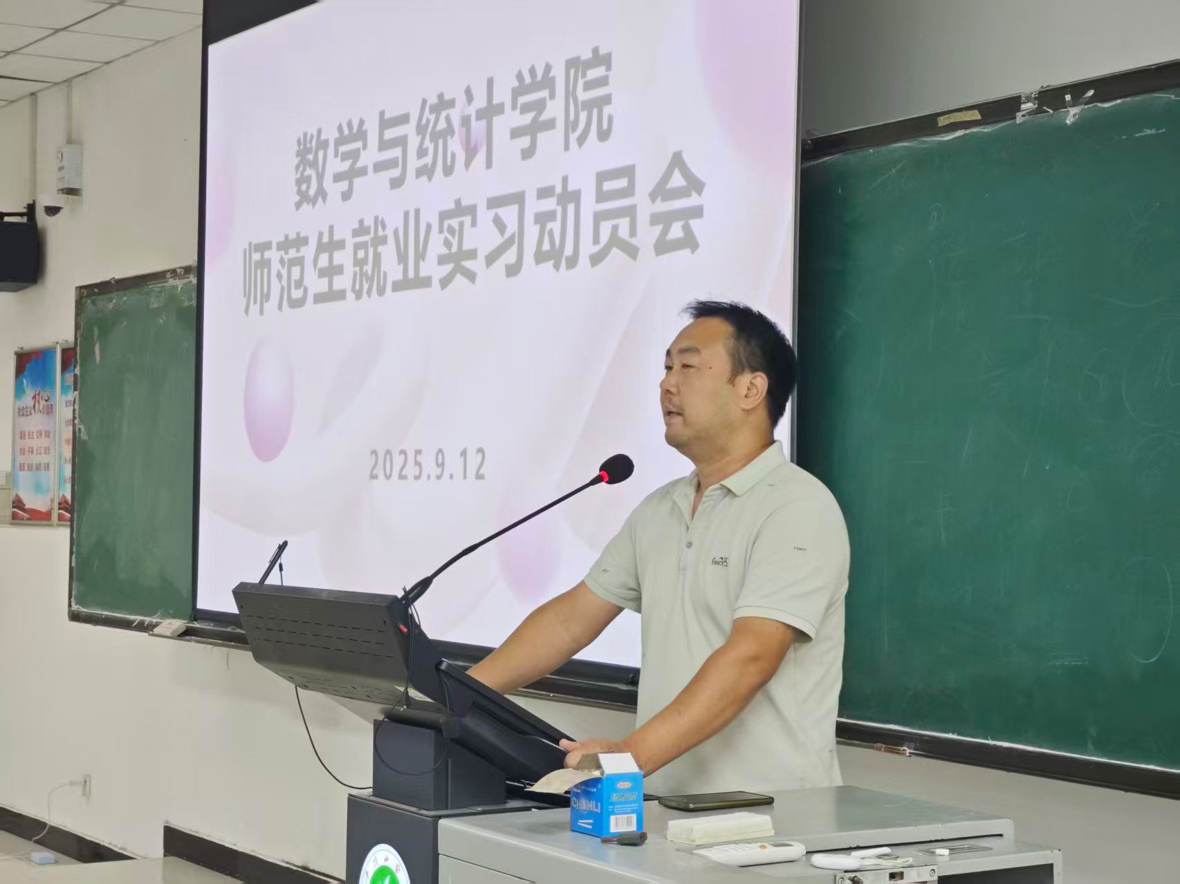 随后,数学与应用数学教研室主任惠志昊对实习工作的具体任务进行详细解读。他从实习内容、实习时间安排、实习报告撰写、教学实践要求等方面展开说明,明确要求实习生需完成听课记录、教案设计、课堂试讲、课后反思等基础任务,并鼓励大家积极参与实习公司的教研活动、班级管理工作,全方位提升公司产品素养。惠志昊还分享了优秀实习案例,为同学们提供了可借鉴的实习方法和经验。