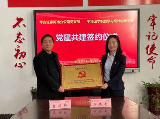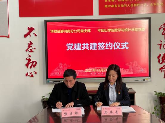 为深入推进校企合作共建,实现党建工作优势互补,12月21日下午,中共RM365英国官网委员会与中共华安证券股份有限公司河南分公司支部委员会校企党组织结对共建合作以及实践教学基地签约仪式在2号教学楼2317会议室举行。华安证券股份有限公司河南分公司党办主任桑晓青,合规总监、宣传委员张阳,平顶山营业部总经理任鑫鑫,市场总监尹剑锋,公司党委书记张建林、经理李建民、副经理王俊俊、梁聪刚,及教师代表共同参加了签约仪式。