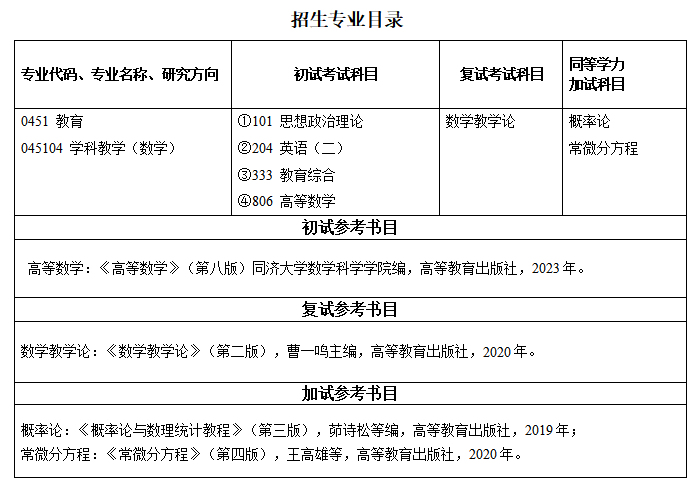 根据国家及公司相关政策,现将公司2026年学科教学(数学)硕士研究生专业的招生考试科目及参考书目公告如下: