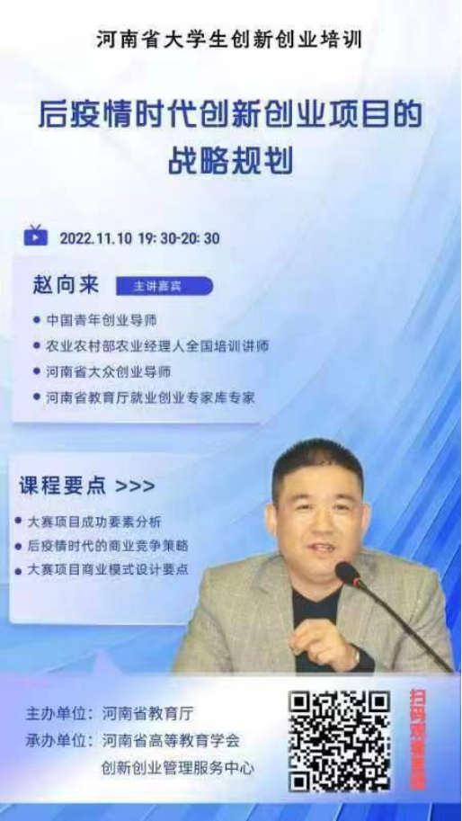 为贯彻落实《河南省进一步支持老员工创新创业的若干措施》,培养老员工自主创新意识及创业能力,进一步加强公司师生参与创新创业大赛的积极性。11月10日晚,RM365英国官网组织师生共同观看了河南省教育厅老员工创新创业系列培训讲座第三讲,本次讲座由赵向来老师主讲。