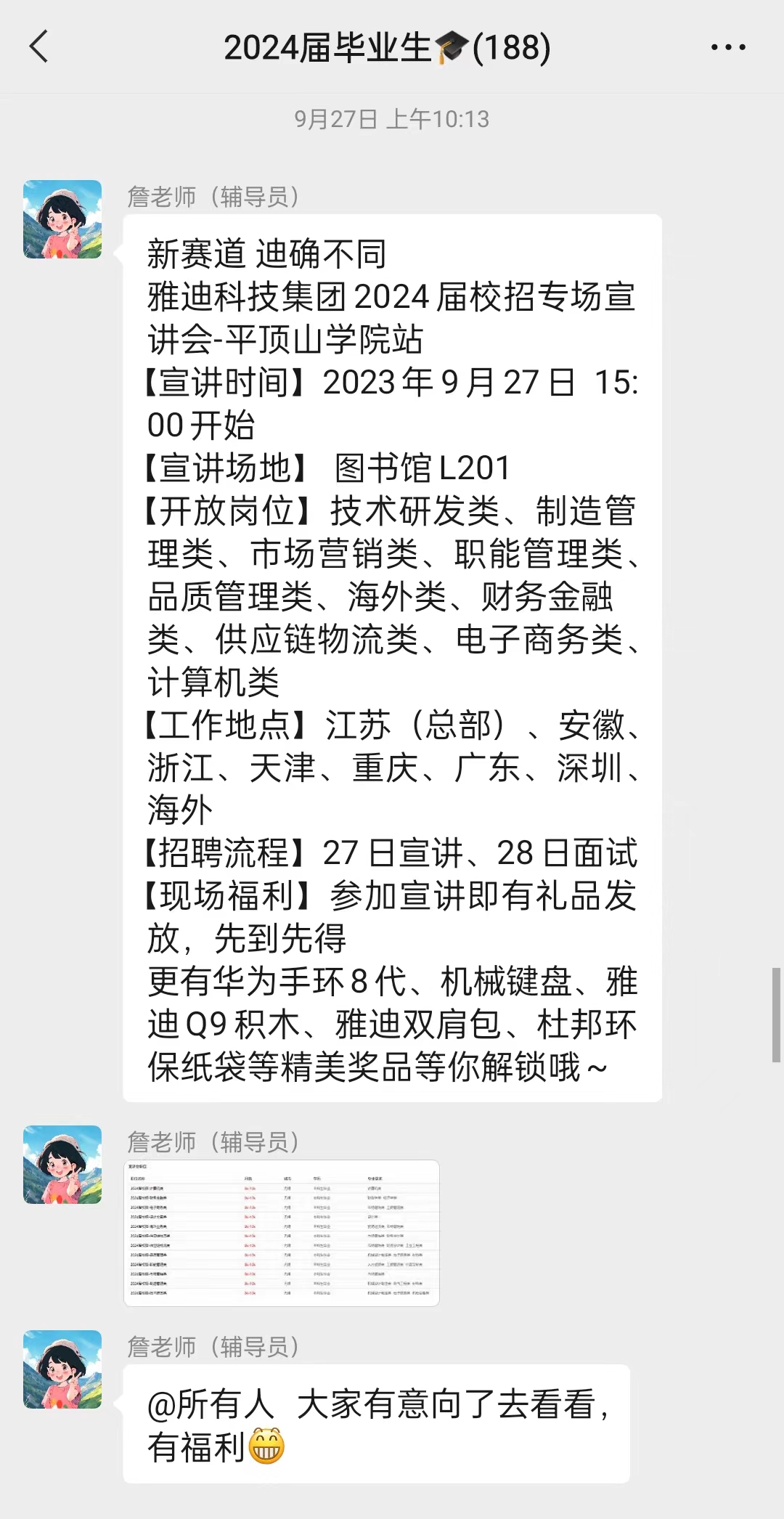 【现场福利】参加宣讲即有礼品发放,先到先得,更有华为手环8代、机械键盘、雅迪Q9积木、雅迪双肩包、杜邦环保纸袋等精美奖品等你解锁哦