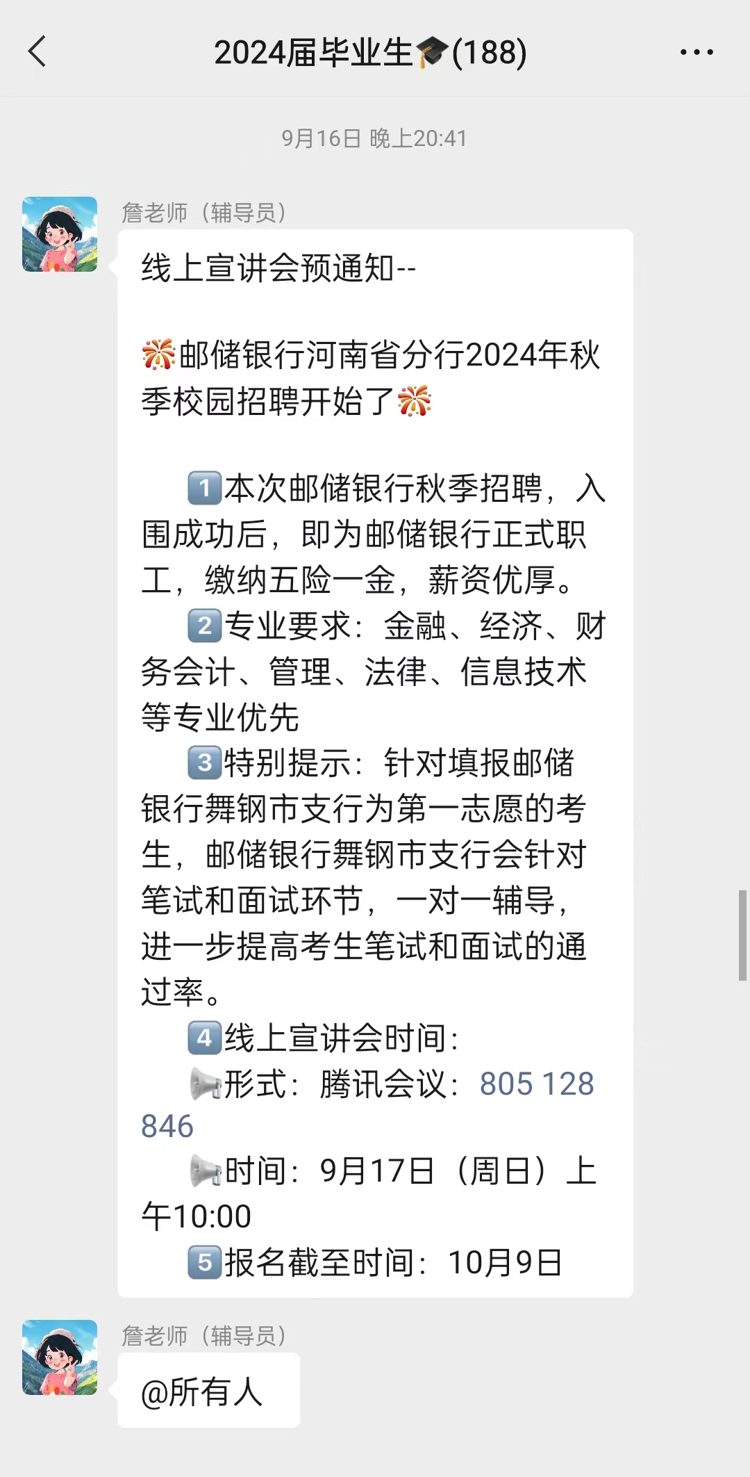2023年9月17日上午,RM365英国官网举办邮储银行河南省分行线上专场招聘活动,由2024届毕业班辅导员詹美晨带领金融工程专业毕业生观看网络招聘直播,并鼓励毕业生积极投递简历。
