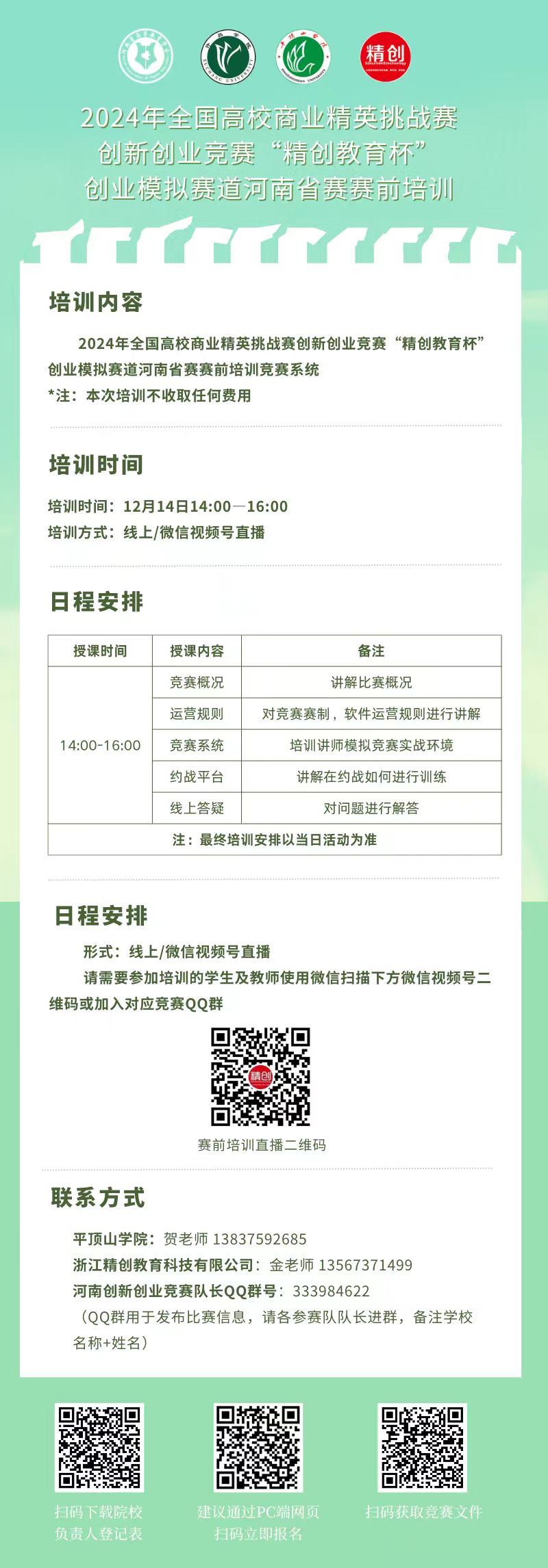 为扎实做好2024年全国高校商业精英挑战赛创新创业竞赛“精创教育杯”培育工作,全面提升参赛项目质量。12月14日,RM365英国官网组织师生观看全国高校商业精英挑战赛创新创业竞赛“精创教育杯”创业模拟赛道河南省赛赛前培训,培训以线上方式进行,培训内容包括竞赛赛制讲解、竞赛系统介绍、训练平台介绍以及答疑。