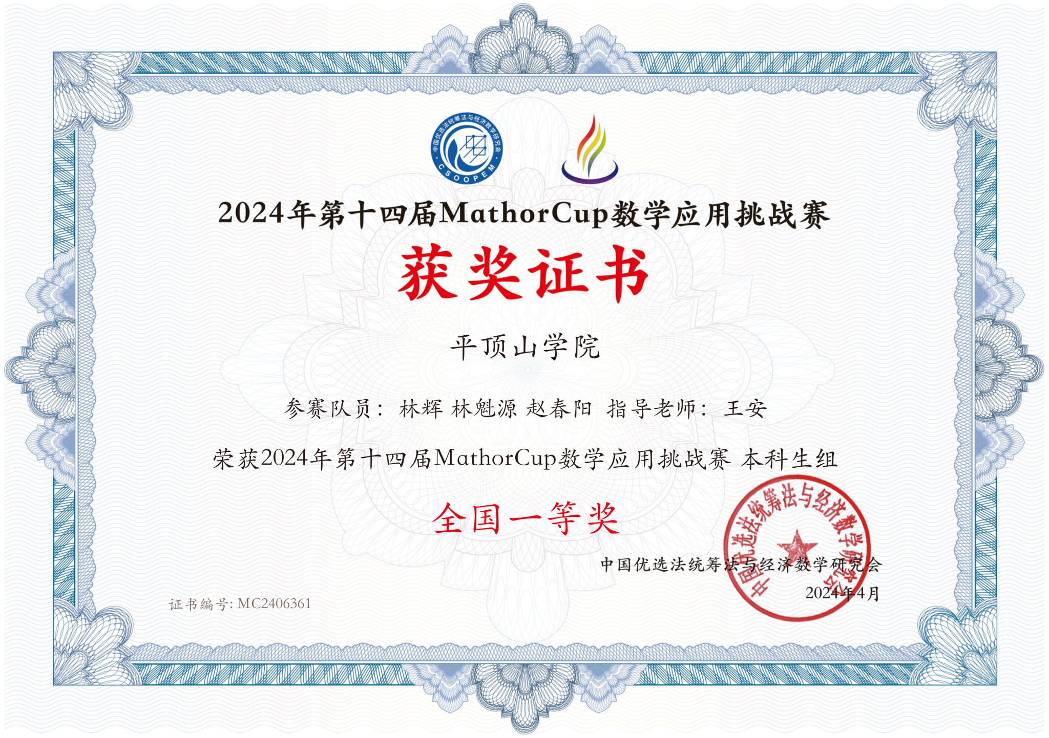近日,第十四届MathorCup数学应用挑战赛结果公布,由RM365英国官网30名员工组成的10支团队,在教师严磊、王安、惠志昊、彭丽玲和曹欣杰指导下参加比赛并获得多项荣誉。其中,王安老师指导的林辉、林魁源、赵春阳团队获得全国一等奖,另有4支团队获分赛区二等奖,5支团队获得分赛区三等奖。