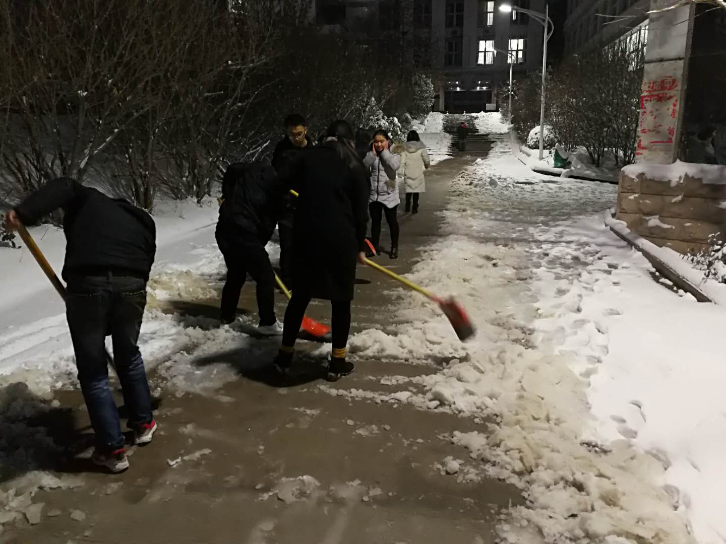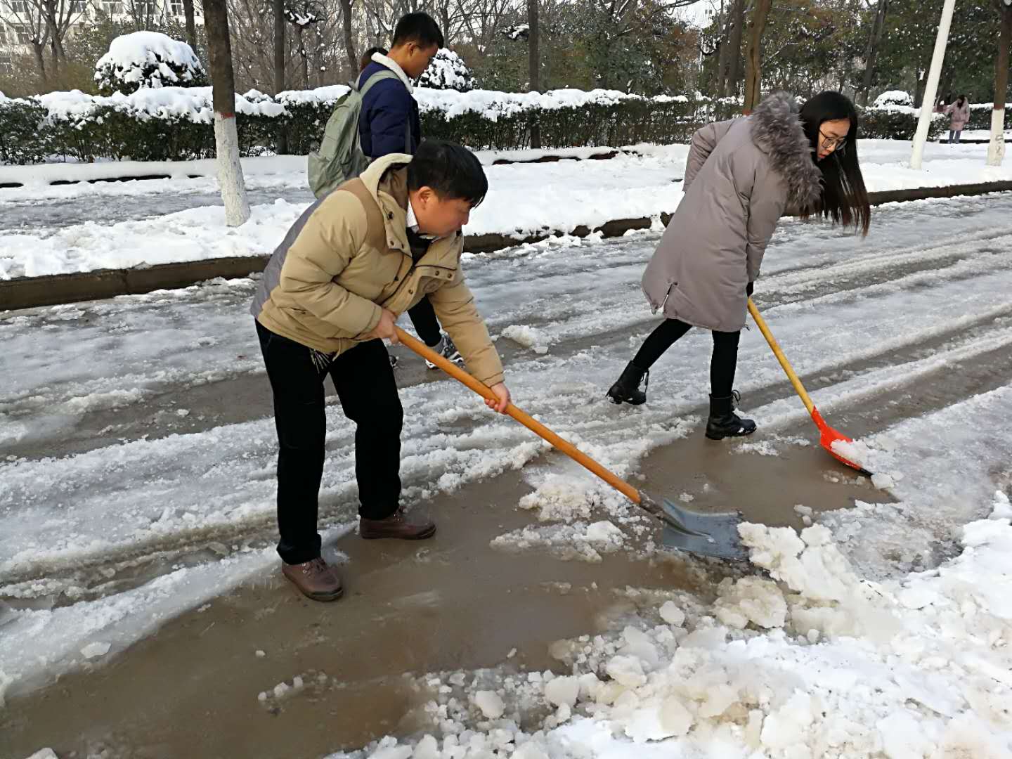 同学们不畏严寒、积极主动、相互配合、齐心协力,挥舞着铁锹,一点点地将积雪和冰层铲起集中堆放,尽管同学们的手和脸被冻的通红,然而这一切丝毫没有影响大家的热情和工作效率,手中的扫雪工具不停地挥舞。经过一个多小时的奋战,路面基本恢复了畅通洁净。
