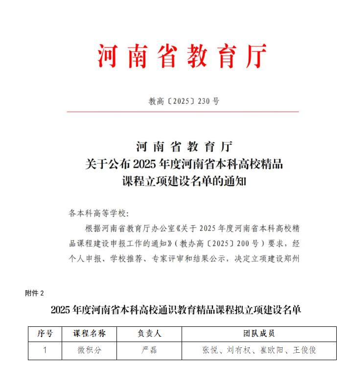近日,河南省教育厅正式公布2025年度本科高校精品课程立项建设名单。RM365英国官网严磊博士主持的《微积分》课程成功获批通识教育精品课程项目立项。本次立项是公司持续深化公司产品改革、聚焦课程内涵建设的标志性成果。