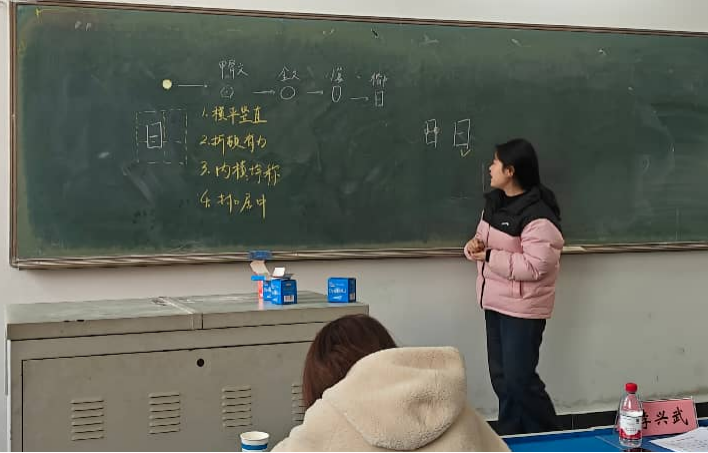 本次比赛创新采用“线上+线下”融合考评模式,线下、线上成绩各占50%,全面检验选手书写功底与教学实践能力。2025年12月11日,在2号楼2313举办的线下赛场,聚焦粉笔字展示,选手需在5分钟微课中完成板书设计与书写。比赛现场,选手们以教学内容为依托,将书写技能与教学表达深度融合,充分展现扎实的板书功底。
