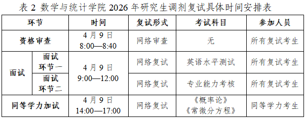 本批次调剂考生复试时间为:2026年4月9日。具体复试安排见下表2。