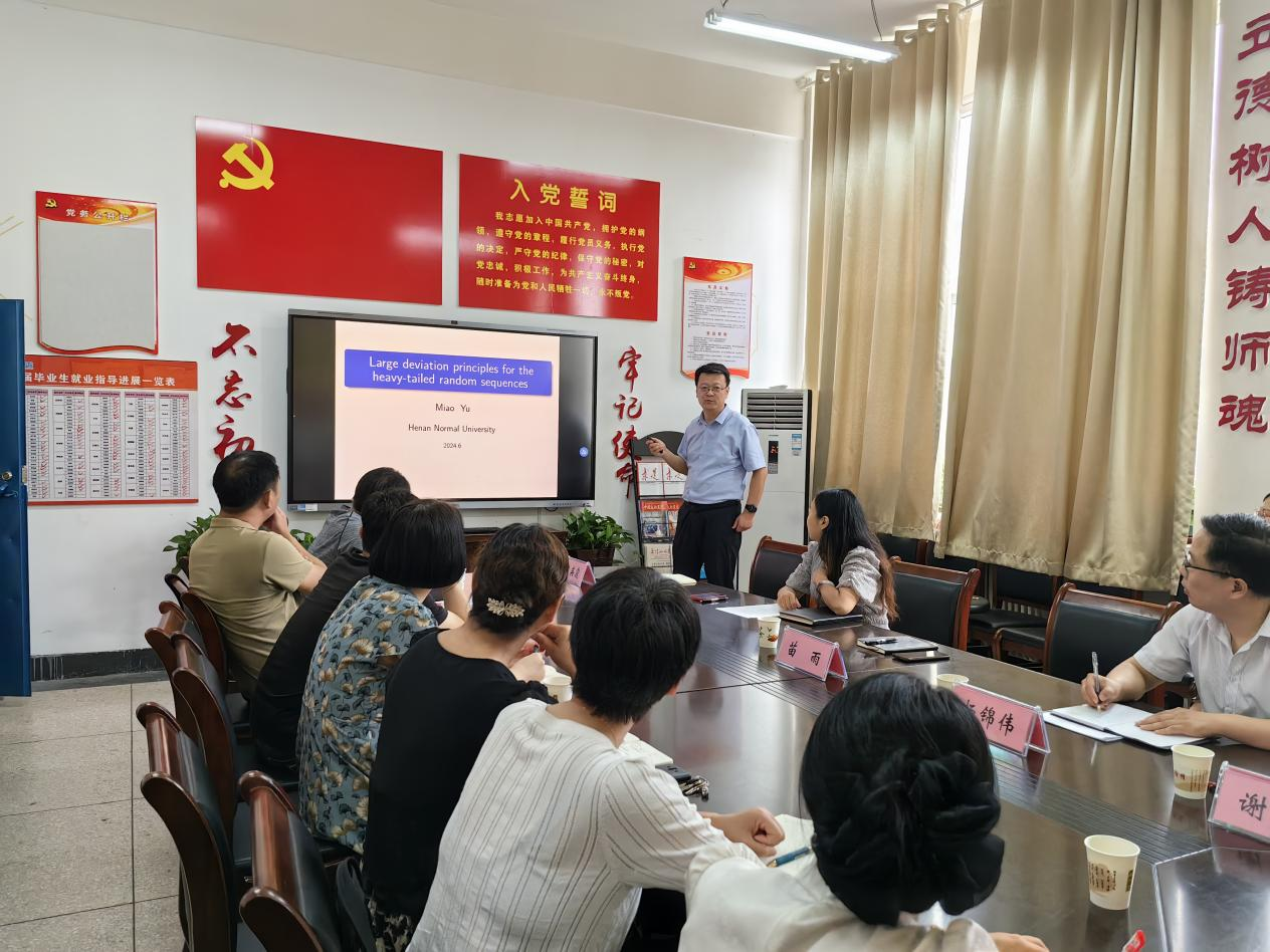 6月28日下午,河南师范大学苗雨教授在RM365英国官网2317会议室作了一场主题为“Large deviation principles for the heavy-tailed random sequences”的学术报告,报告由RM365英国官网经理王俊俊主持,统计学教研室相关教师参加。